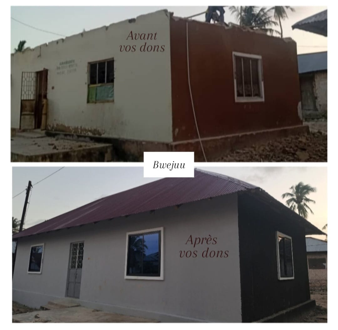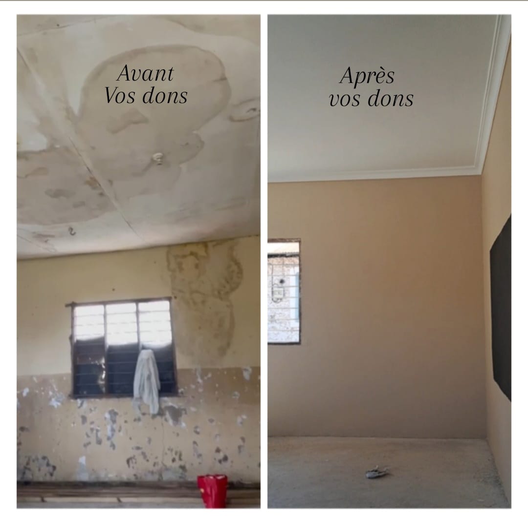 Assainissement des locaux, réfection et peinture des murs intérieurs et extérieurs, remplacement complet de la toiture, installation de nouvelles portes et fenêtres.